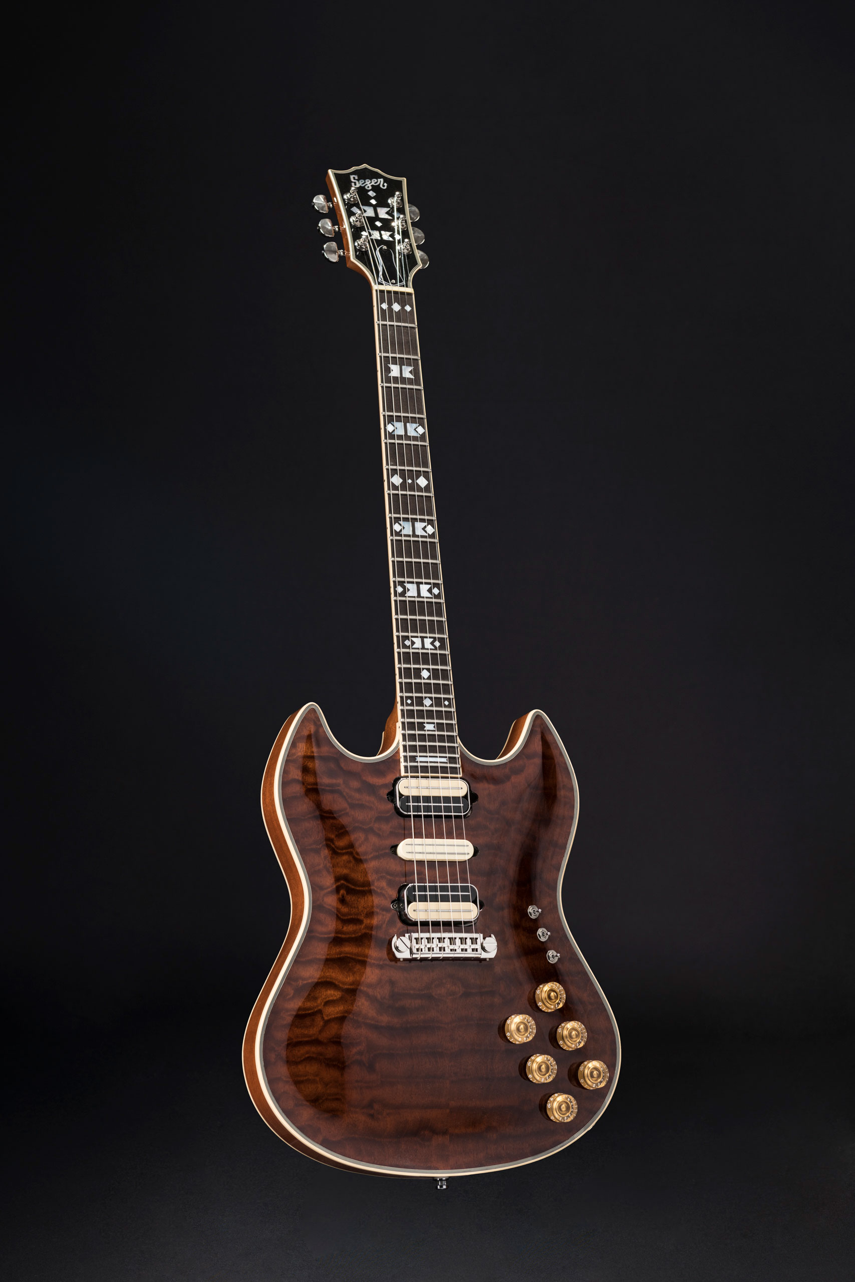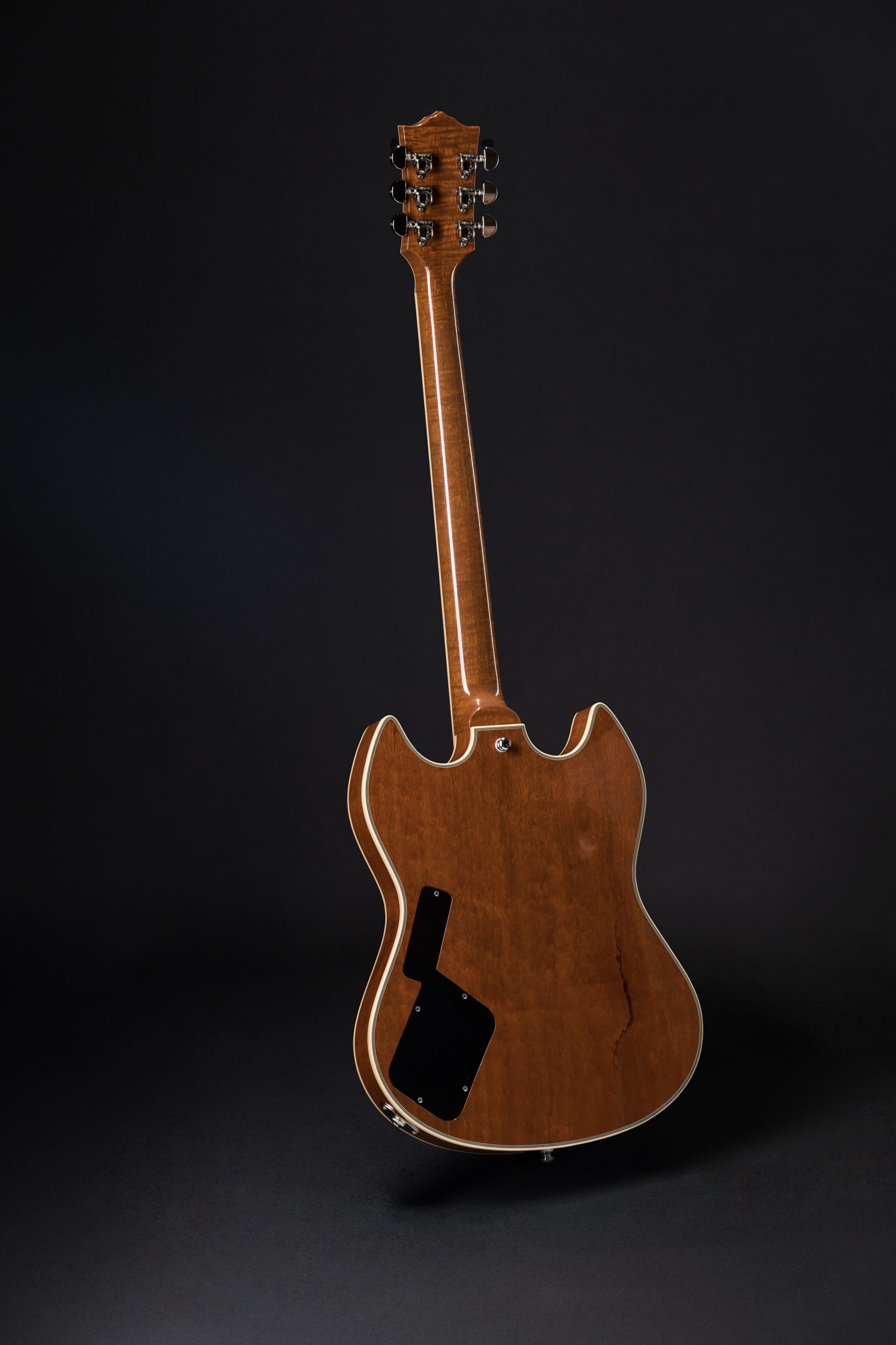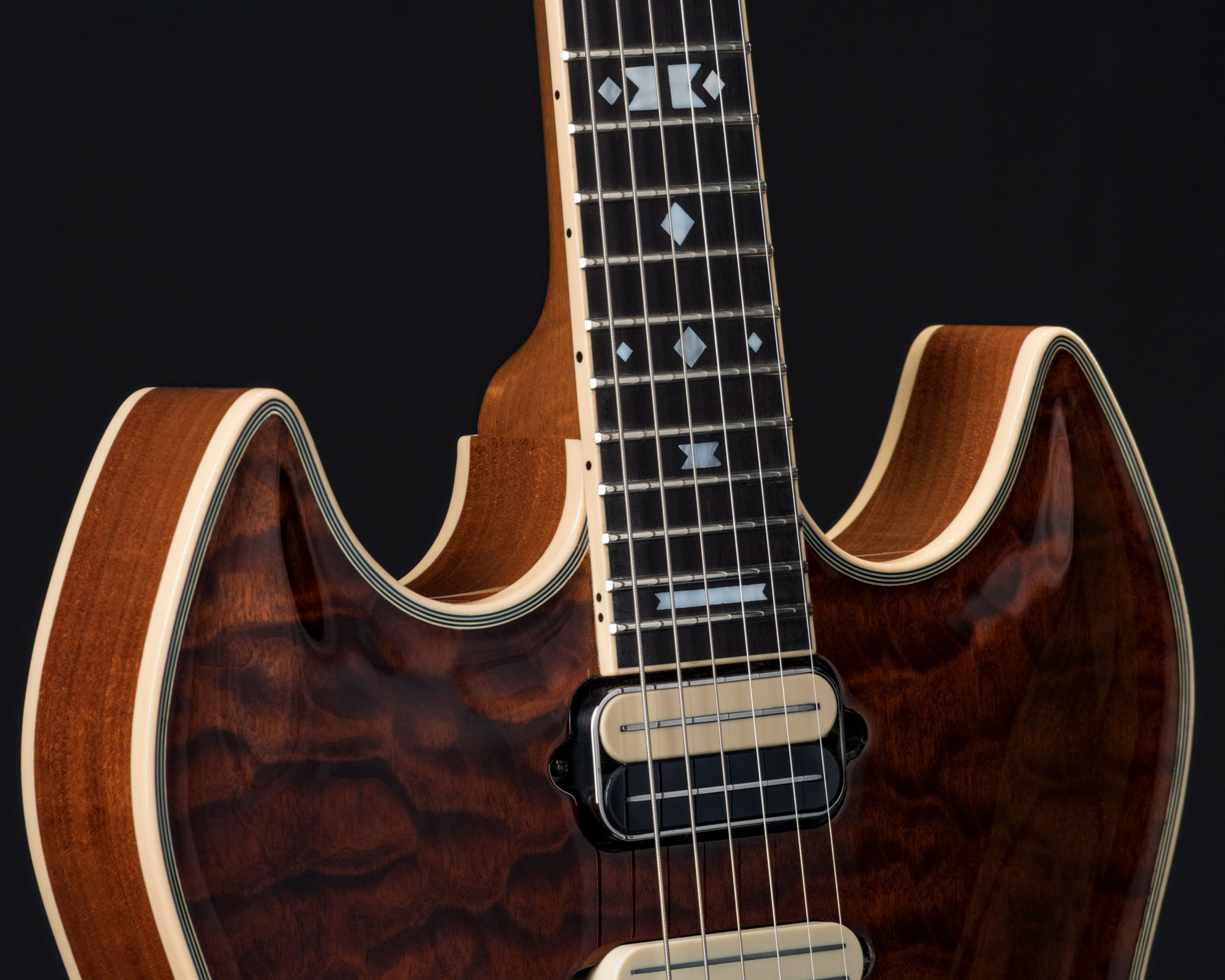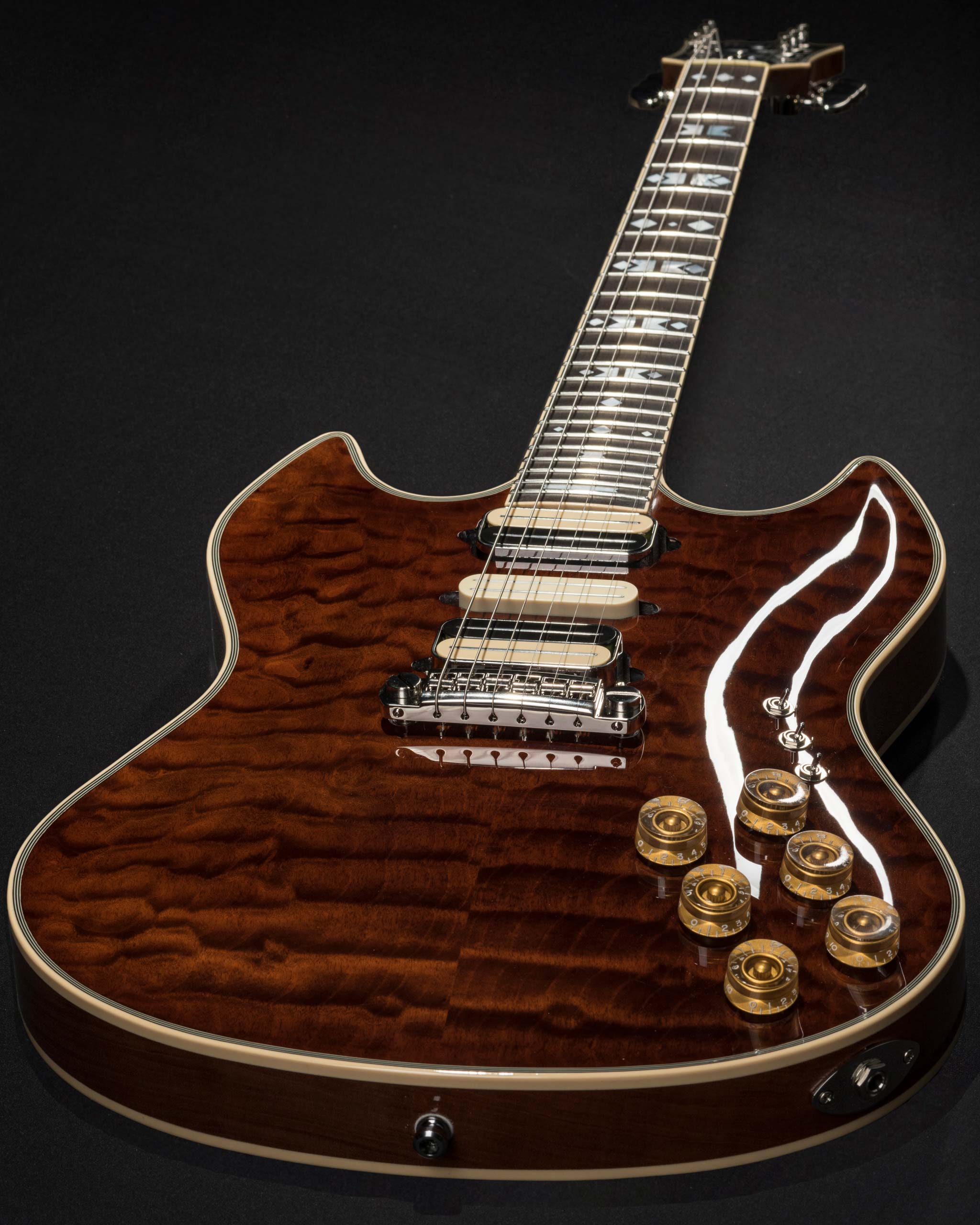Rootbeer top YG with Big Leaf Quilted Maple archtop and flame Honduran Mahogany body.