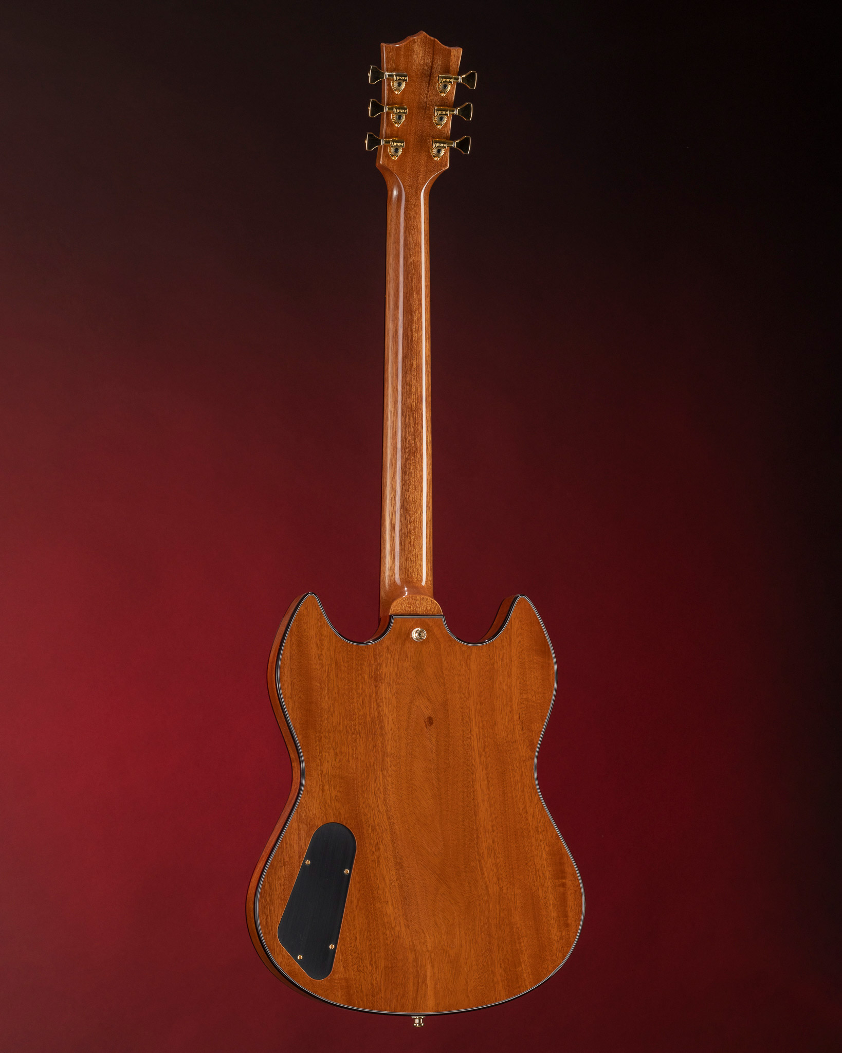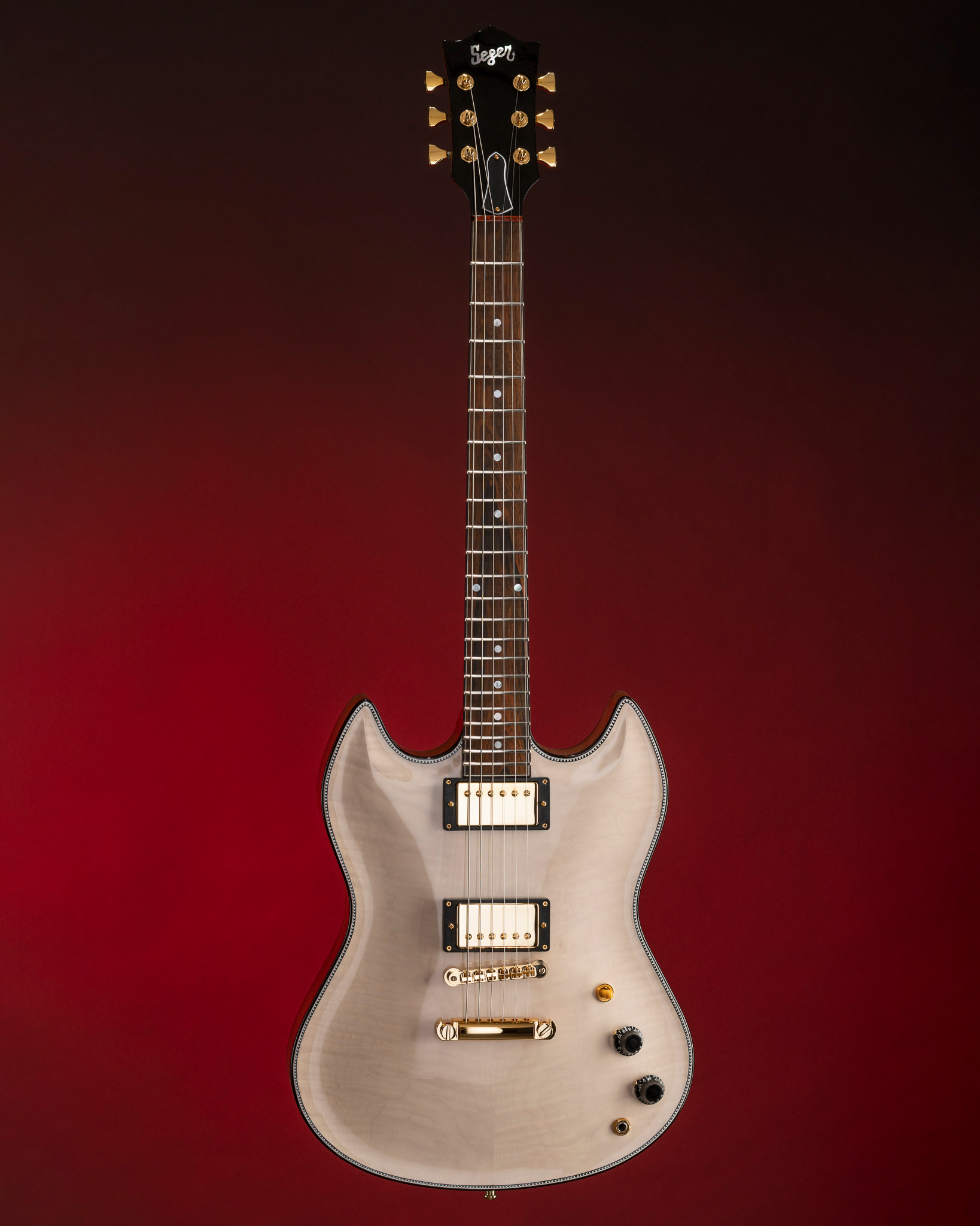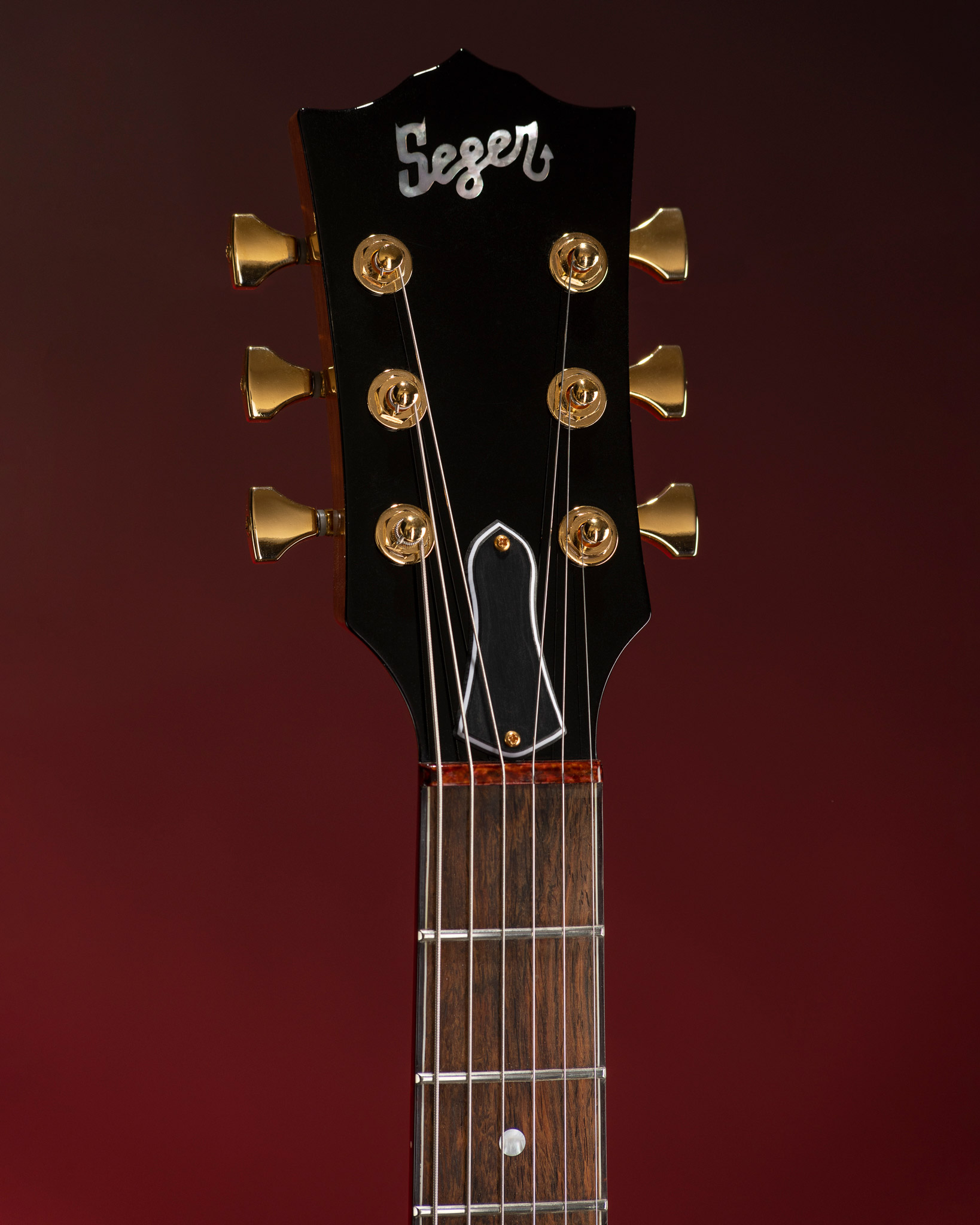 Love the color palette on this one, the old hardware, tortoise binding and semi opaque top is really eye catching. I had some distorted checkerboard binding I had saved since some of the pieces were quite interesting. I used them on this guitar, cutting and gluing together dozens of pieces so that the distortion was even and symmetrical on the body.