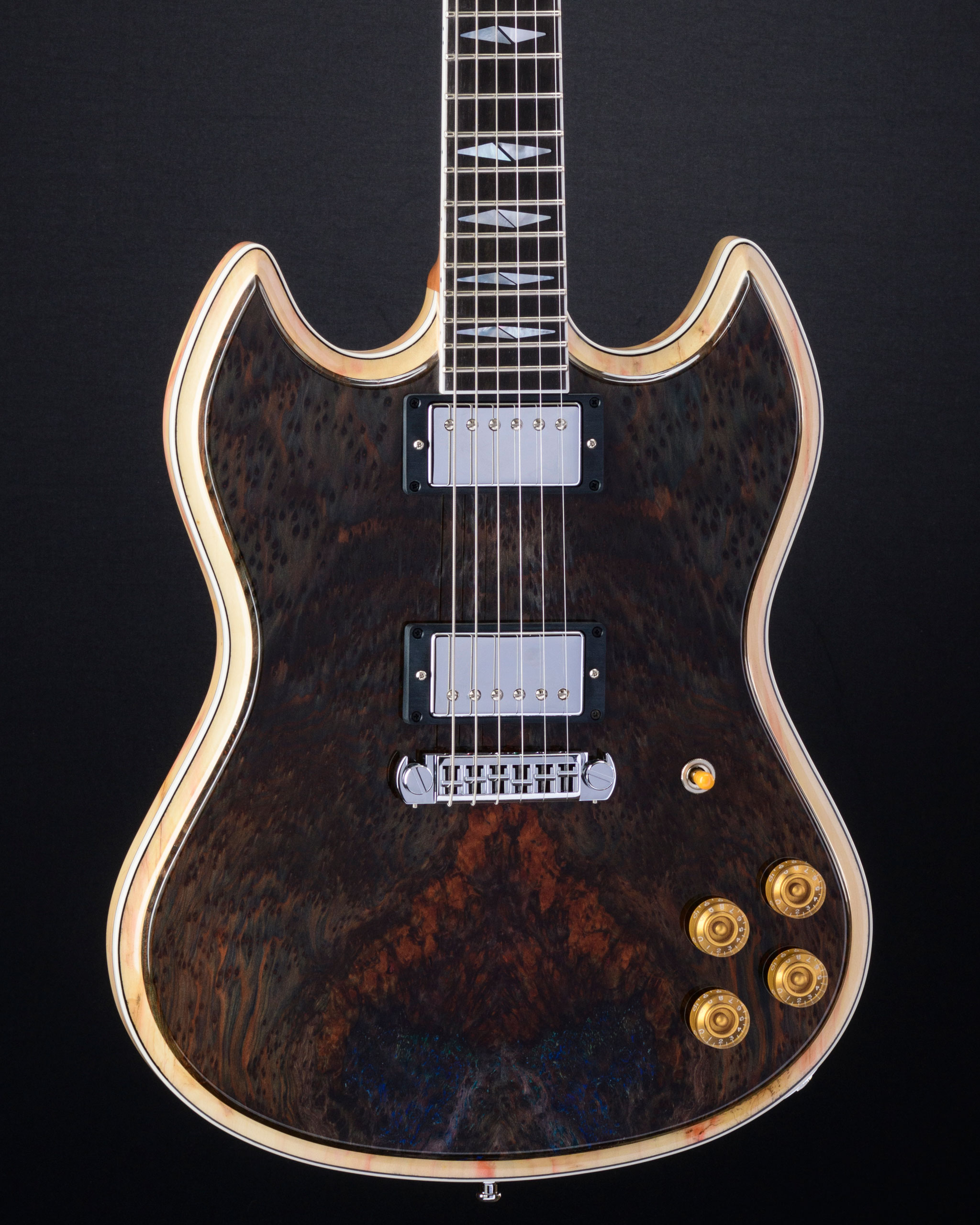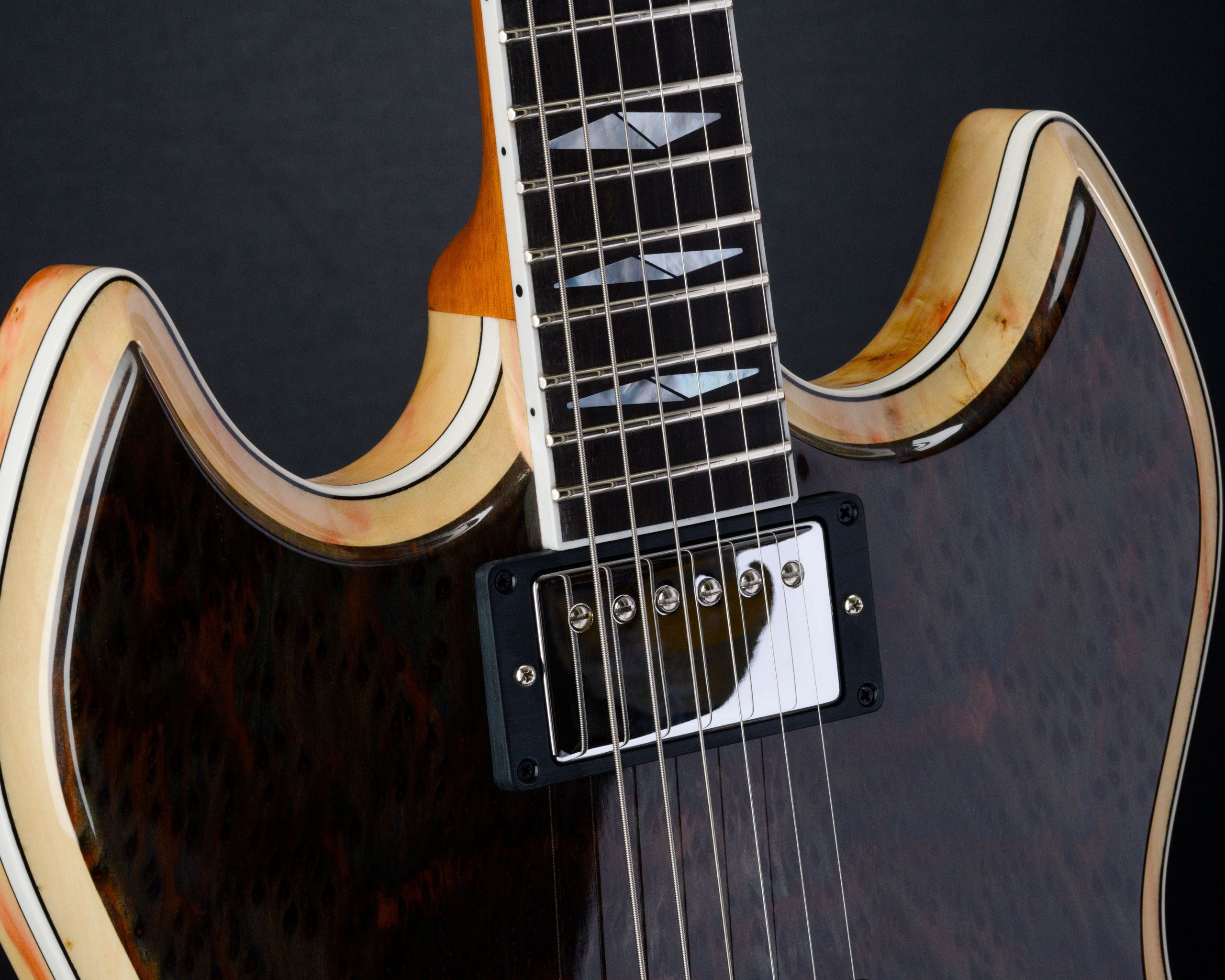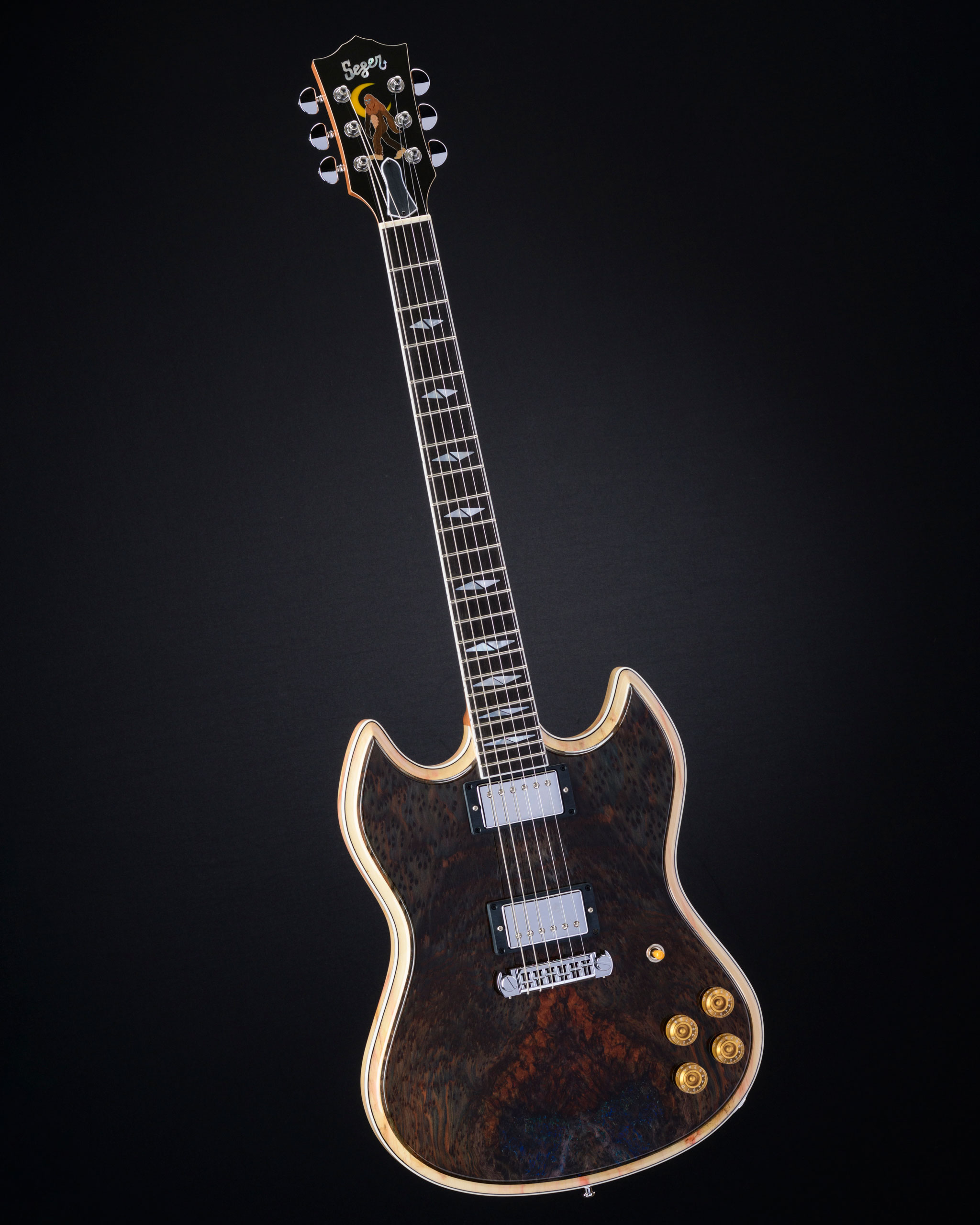This burl redwood top and wild Tim Lehi Bigfoot headstock are a perfect match.